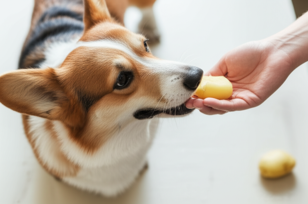 Plain boiled or baked potato (no skin, no toppings) is safe for healthy dogs in small amounts. Raw potato is toxic — never feed it. Green potato and potato skin also have elevated solanine. Diabetic dogs should avoid potatoes. Sweet potato is a healthier alternative.
