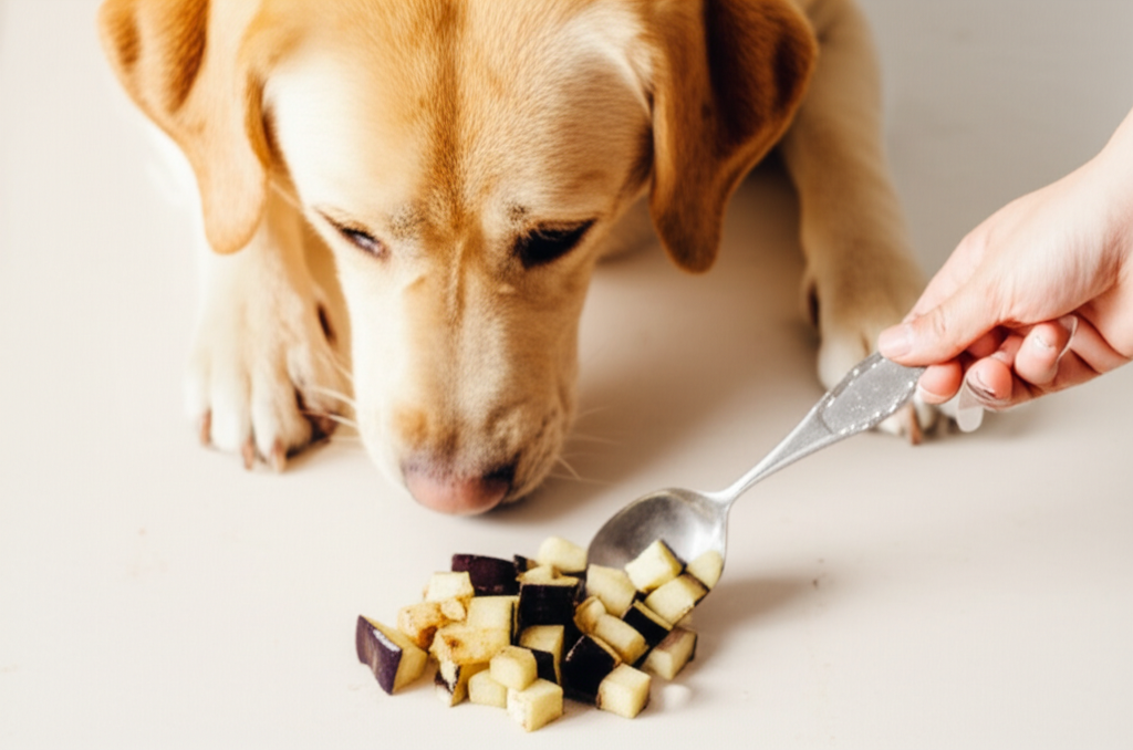 Never serve eggplant prepared with garlic, onions, olive oil, cheese, salt, or the spices used in dishes like moussaka or baba ganoush — all potentially harmful to dogs. Some dogs may have a nightshade sensitivity or allergy showing as skin itching, hives, or vomiting. If your dog shows any of these signs, discontinue immediately and consult your vet.