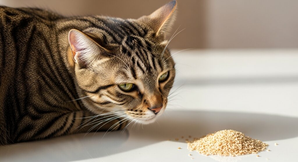 Though small, sesame seeds can still pose a physical risk to cats. For very small cats, kittens, or cats that tend to eat quickly without thoroughly chewing, there is a minor risk of choking or aspiration. While not the most significant danger, it is an avoidable one by simply keeping these seeds away from your pet.